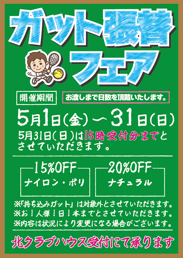 5月1日(金)~5月31日(日)の期間でガット張替えフェアを開催いたします!!後半は混雑が予想されるため、お早めの張替えをおすすめいたします。※クラブ会員・スクール生に限ります。↓詳細はこちら↓